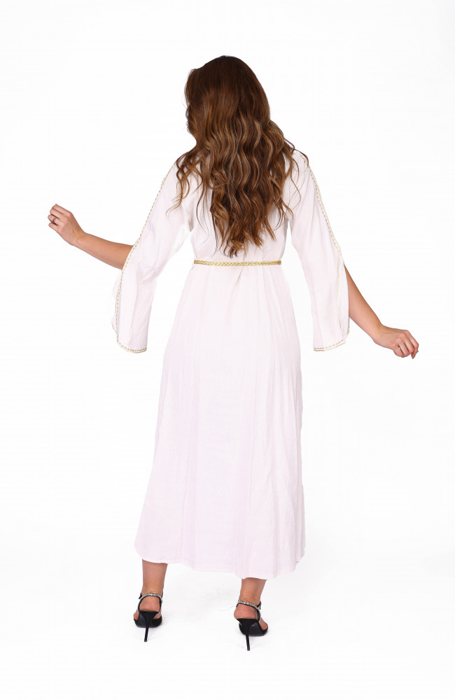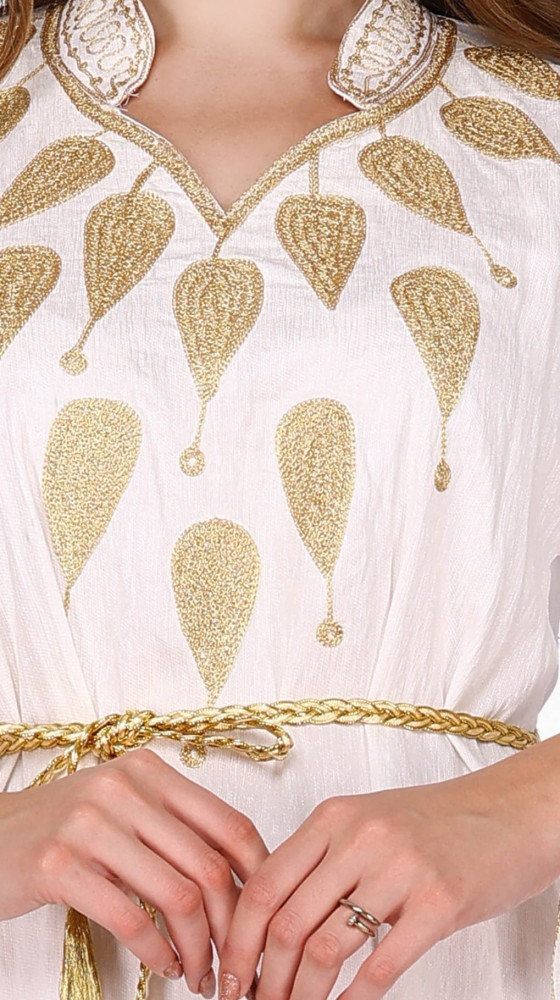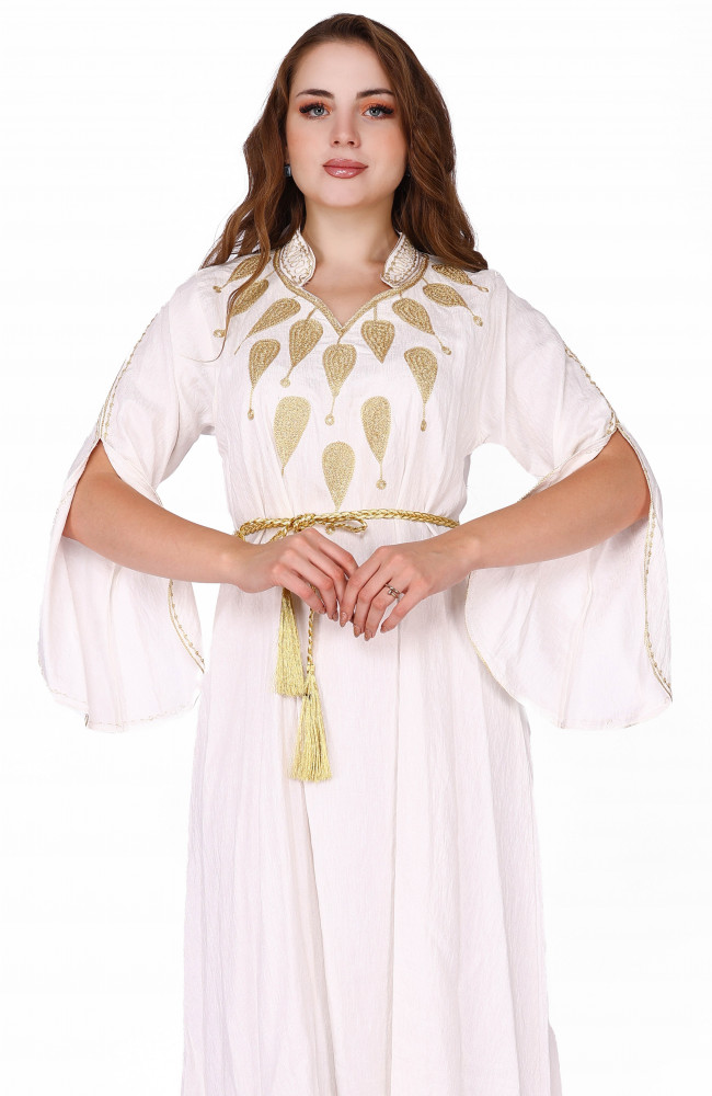 جلابية أوف وايت بأكمام مفتوحة وتطريز فاخر على الصدر والياقة – من بلاك وينج