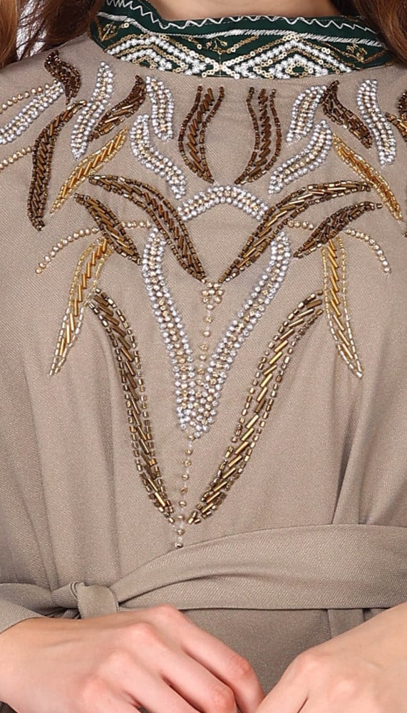 جلابية زيتي بشك يدوي من بلاك وينج – إبداع التفاصيل وسحر الفخامة