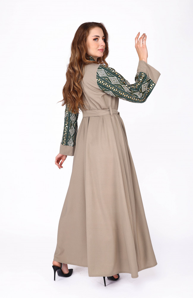يتألق هذا التصميم الفريد بلونه الزيتي العميق الذي يجمع بين الدفء والفخامة، مما يجعله مثاليًا لمختلف المناسبات. ينساب القماش الفاخر بانسيابية رائعة، ليعانق القوام برقي ويمنحكِ راحة لا مثيل لها طوال اليوم.