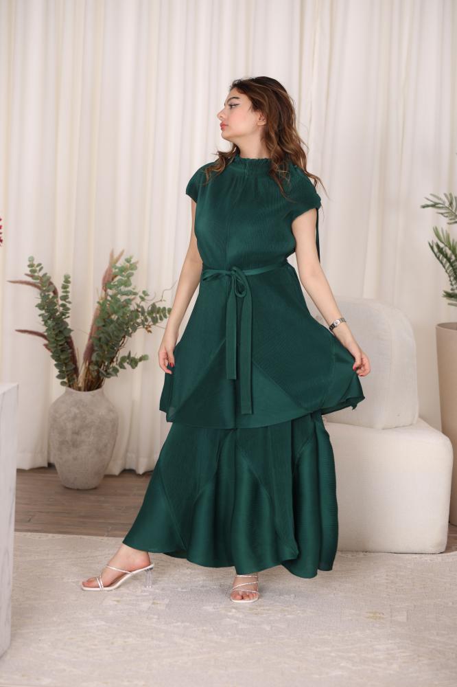 يُعزز التصميم بالطبقات الرفيعة التي تضفي على الفستان إطلالة متجددة وحيوية، مع إبراز الخصر بفضل الحزام المدمج الذي يمكن ربطه بشكل يناسب ذوقك الشخصي. الطيات المتناغمة التي تغطي الجزء السفلي من الفستان تضفي لمسة من الأناقة العصرية، بينما الكُم القصير يزيد من جاذبية الفستان ويجعلها مثالية للمناسبات الصيفية أو الانتقالية بين الفصول.