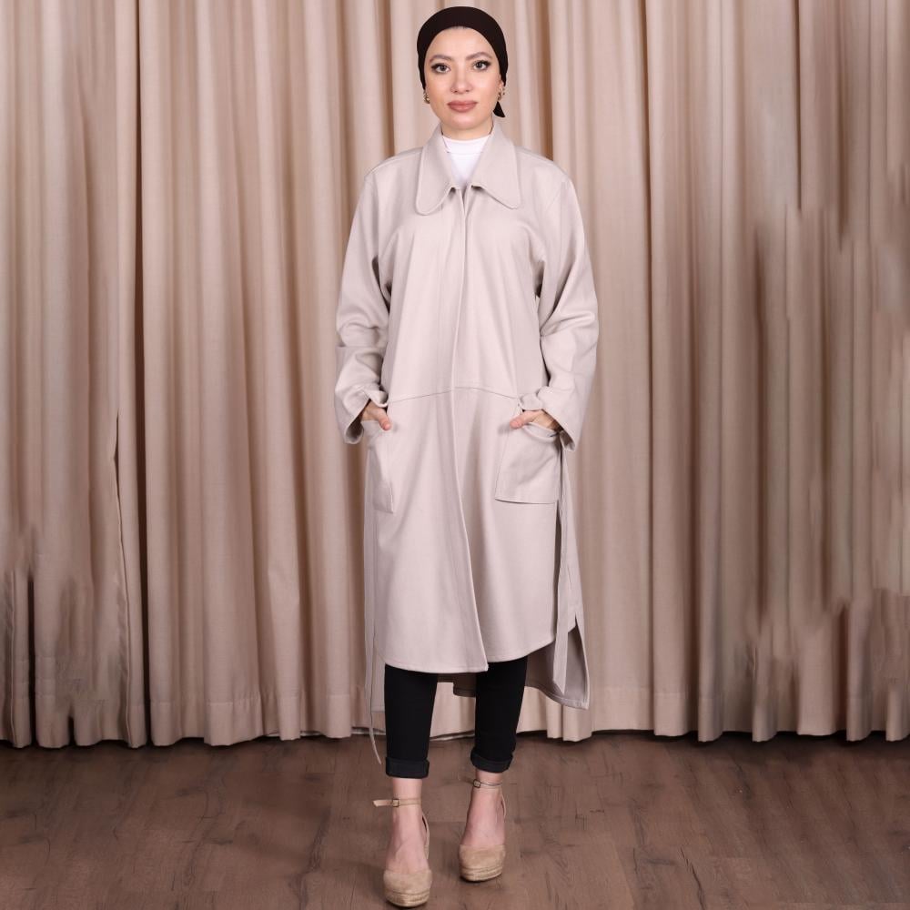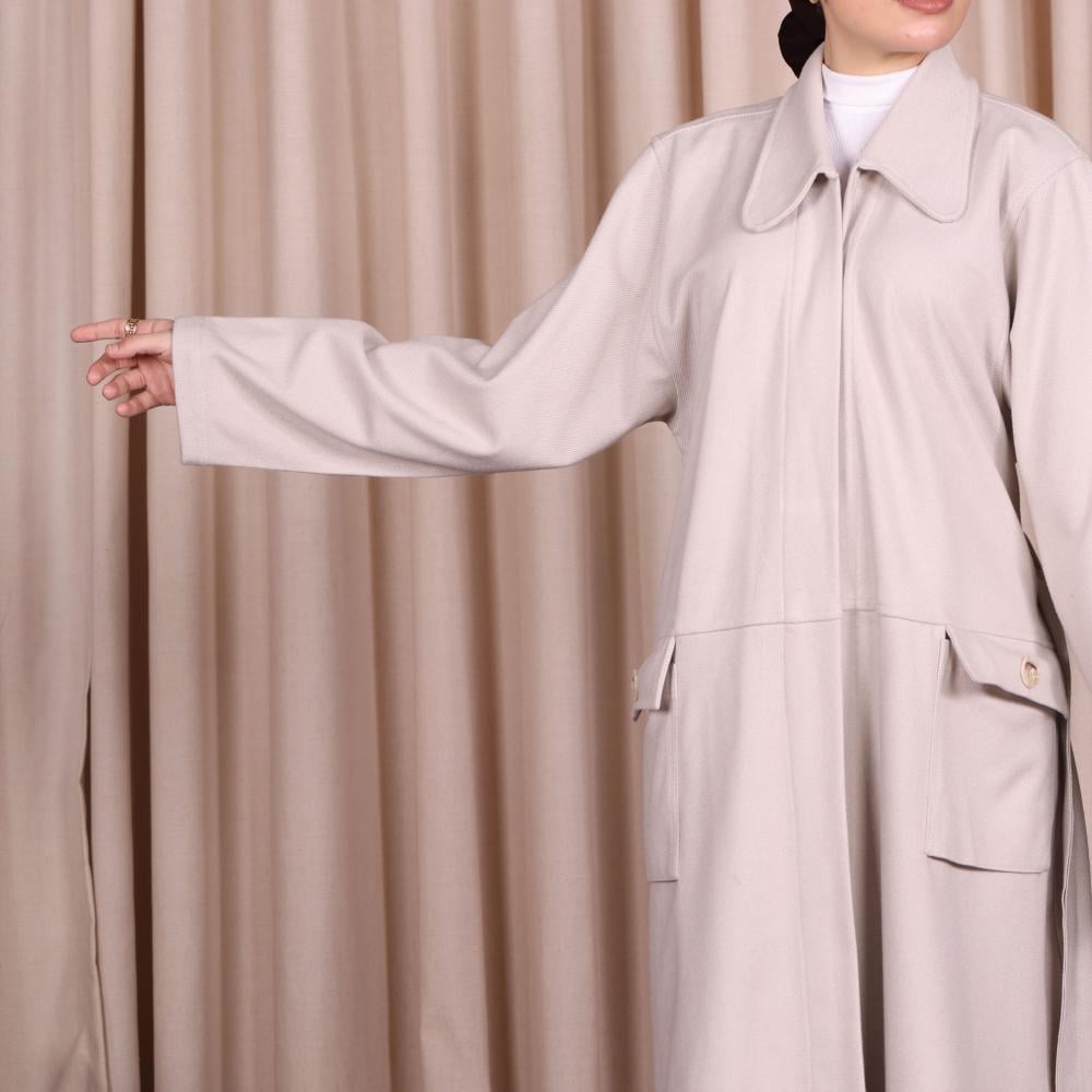 استمتعي بموسم الشتاء مع معطف شتوي مصنوع من قماش الجوخ المخطط بلون البيج، الذي يجمع بين الرقي والجودة العالية. هذا المعطف هو الخيار المثالي للمرأة العصرية التي تبحث عن الراحة والجاذبية في نفس الوقت.